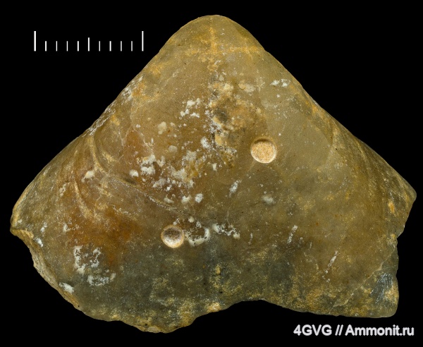 Фрагмент раковины брахиоподы Camerisma pyramidata со следами сверления. Интересно, что повреждения найдены только на раковинах этих брахиопод сверление