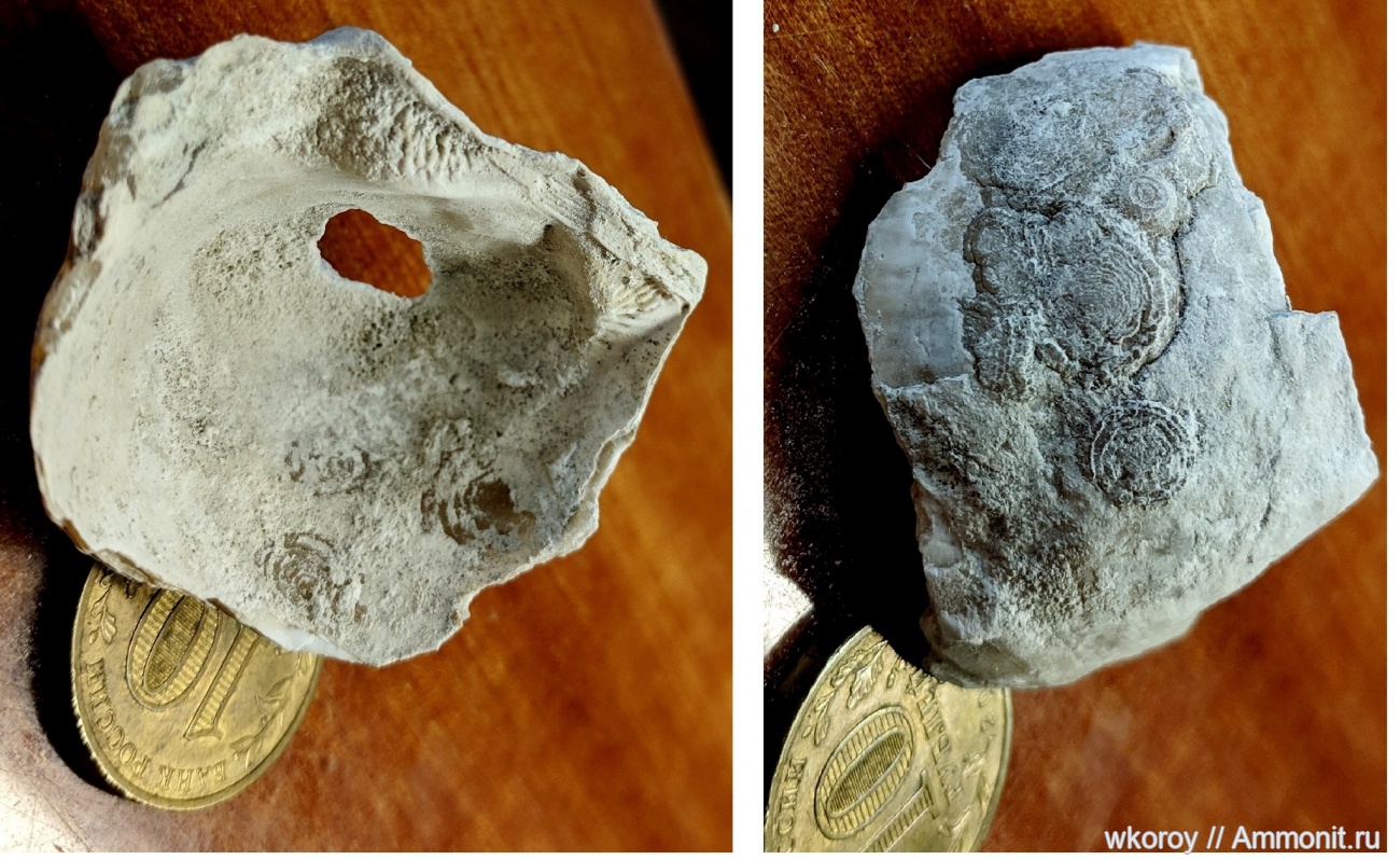 Это не брахиопода и не нуммулиты. Это двустворка, что то из устриц. А окружности, это минеральные образования, проступившие при частичном растворении раковины. Подобное уже выкладывали на сайте, действительно интересные вещи. | ||||||