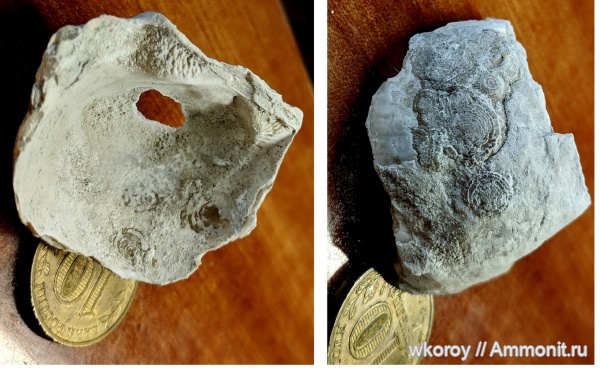 Моллюск из меловых отложений, обнаруженный в меловом карьере. На поверхности и внутри видны минеральные образования, проступившие при частичном растворении раковины. Спасибо за подсказку пользователю Urizel
