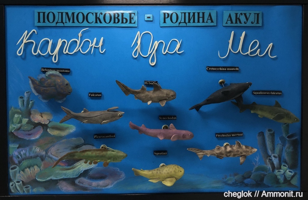 Так назвали мы с ученицей проектную работу, цель которой -- создать наглядное пособие для кабинета биологии (с целью популяризации палеонтологии). Работа полностью сделана ученицей (Катей Зазерской), размер стенда 145 см в длину. Фигурки акул объёмные, сделаны из глины.