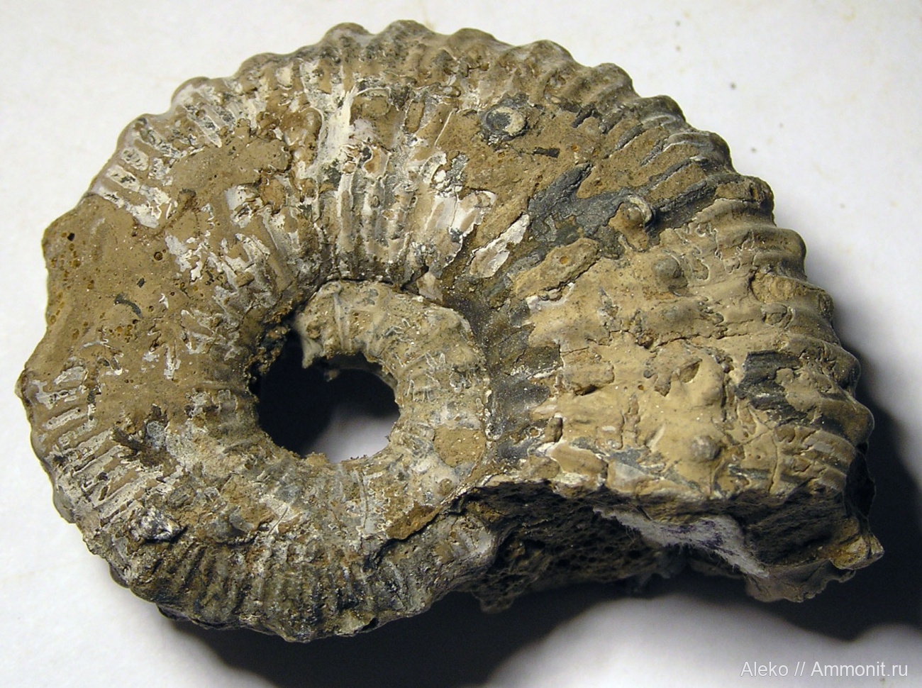 Мергелевый слепок начальных оборотов аммонита Kosmoceras cf. geminatum, Михайловцемент, верхний келловей, слой с мергелевыми конкрециями, вероятно, зона Quenstedtoceras lamberti.