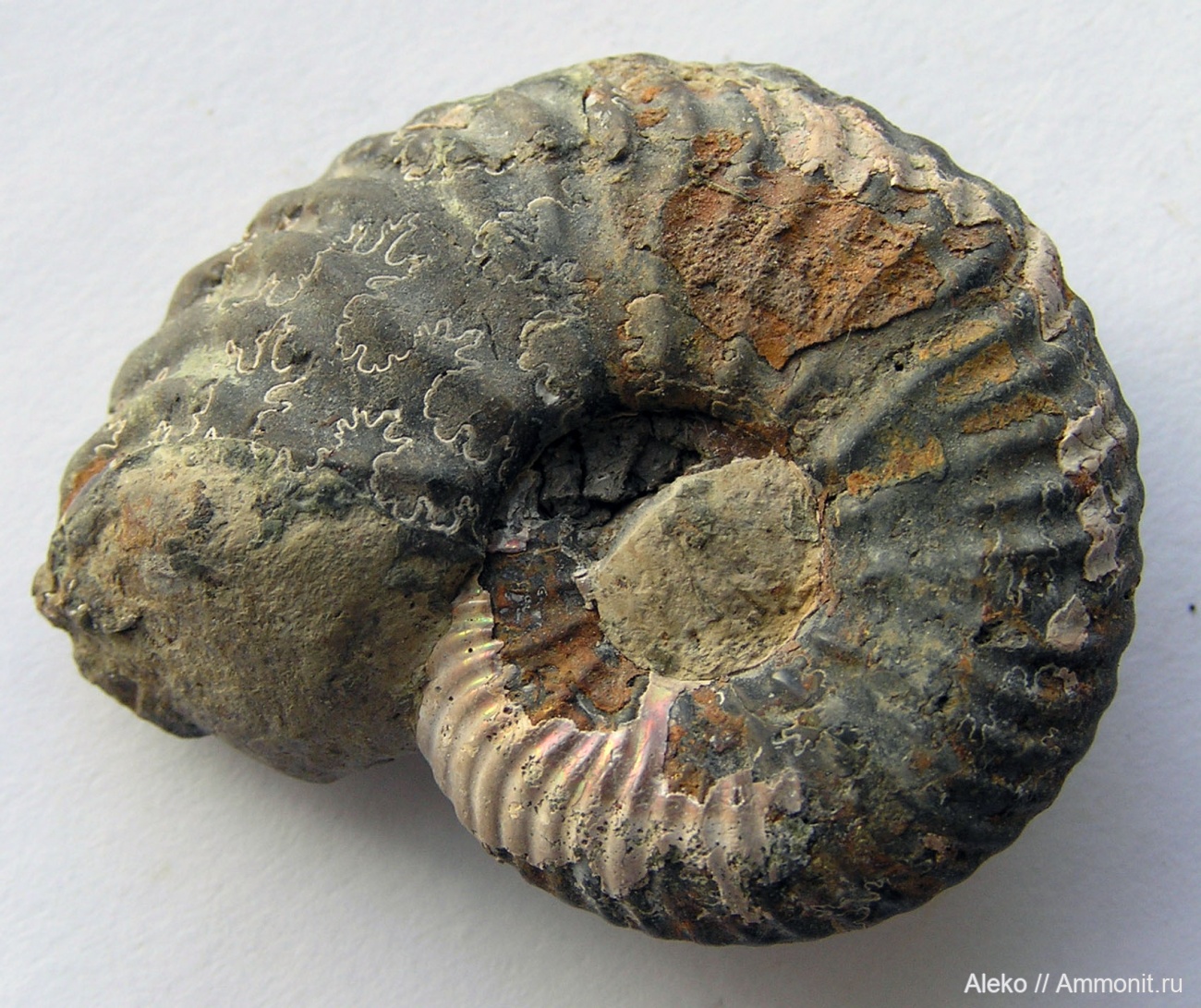 Ядро аммонита с сохранившимся очень небольшим фрагментом раковины в левой нижней части снимка.