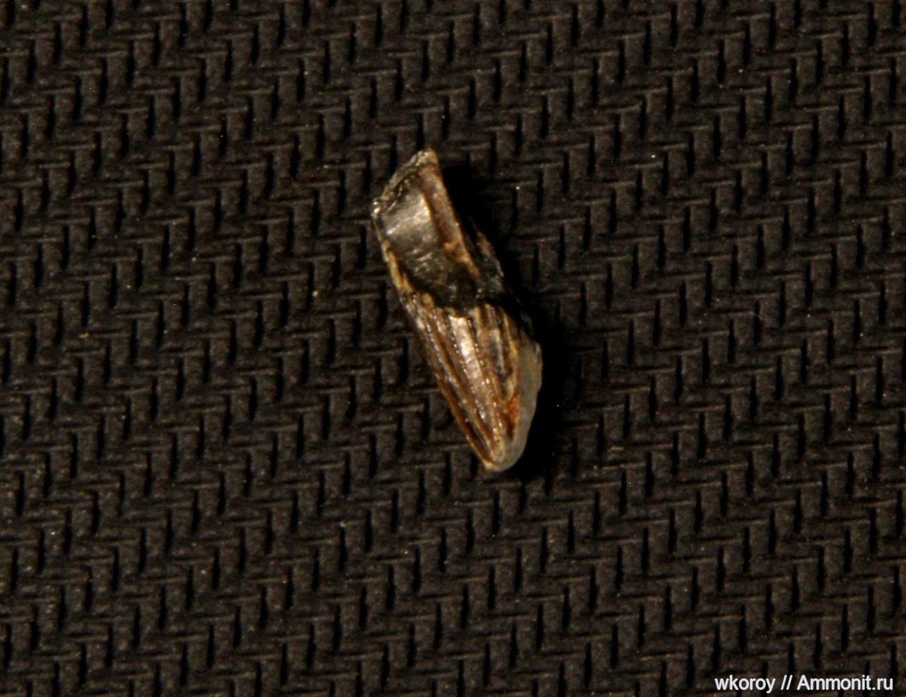 Фрагмент зуба плезиозавра из песчаного карьера Курской области. Высота 1.2 см.