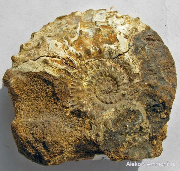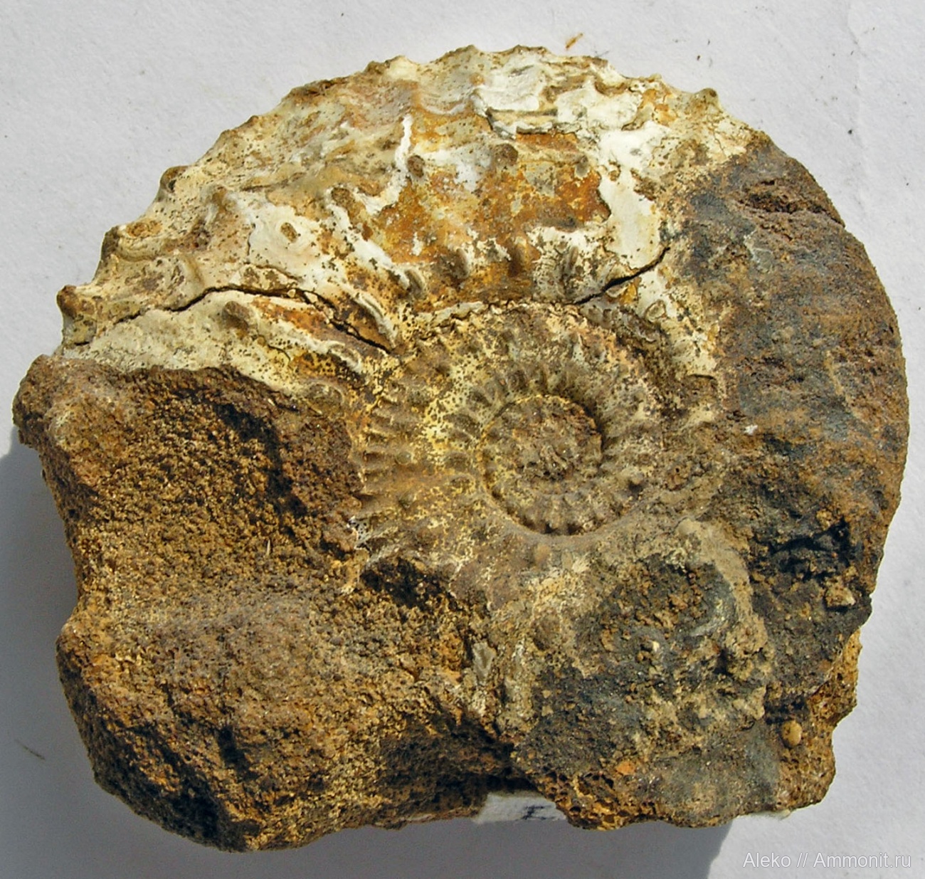 Вот такой любопытный аммонит попался мне лет 15 назад в среднем келловее в Елатьме. Аммонит очень узкий, отношение толщина/высота примерно как у Gulielmiceras-ов из Никитино. На конечном обороте ребра чрезвычайно редкие, каждое заканчивается в отдельном резко выдающемся бугорке. 15 лет ищу что-то подобное во всей литературе, и ничего близкого не нахожу.