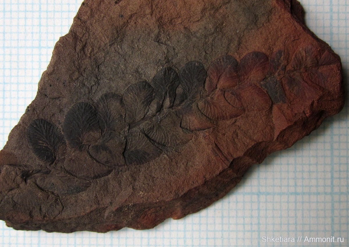 Лист птеридосперма Neuropteris cf. rarinervis с неплохо читающимся жилкованием, в цветовой гамме хмурого заката.