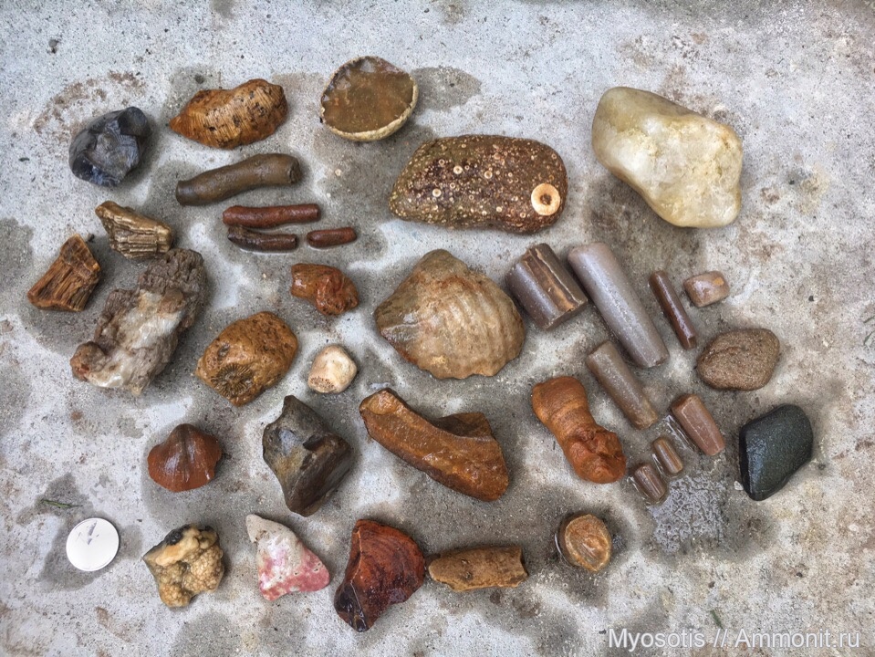 Ну, я вижу окремнелую брахиоподу в центре, справа от нее несколько обломков белемнитов, слева вверху рыжий камушек - что-то очень отдаленно напоминающее часть оборота аммонита (но при таком качестве ничего больше сказать вообще нельзя), над брахиоподой (опять же, только возможно!) камешек с члениками стебля и "рук" морской лилии, остальное - скорее всего, просто камушки разного типа, не имеющие отношения к палеонтологии.