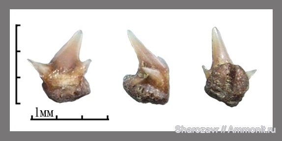 Но на Eostegostoma не очень похож. Смущает глубокая питательная канавка. У тех зубов Eostegostoma, которые я увидела в интернете, присутствует форамен. | ||||||
