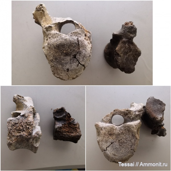 Найдены оба образца в Путилово, в Московской области. Песчанный карьер с крупными толщами буро-чёрной глины, в которой попадается какой-то серо-зеленый сланец. Не юверен, но, возможно это юрские глины, я тут не знаток. позвонки разного размера и цвета (первый найден на отвалах, а второй вытащен из глины. Диаметр светлого - 6,5см, второго - 4см.