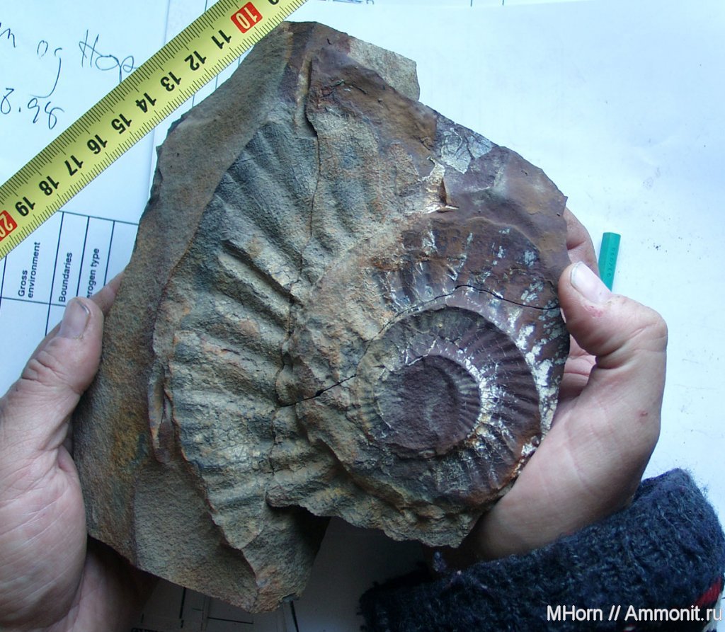Этот своеобразный аммонит (вернее, отпечаток аммонита) из верхней части средневолжского подъяруса был найден на склоне г. Миклегард (бухта Агард, восточное побережье Западного Шпицбергена) в 2007 году. По-видимому, он относится к бореальному роду Taimyrosphinctes.