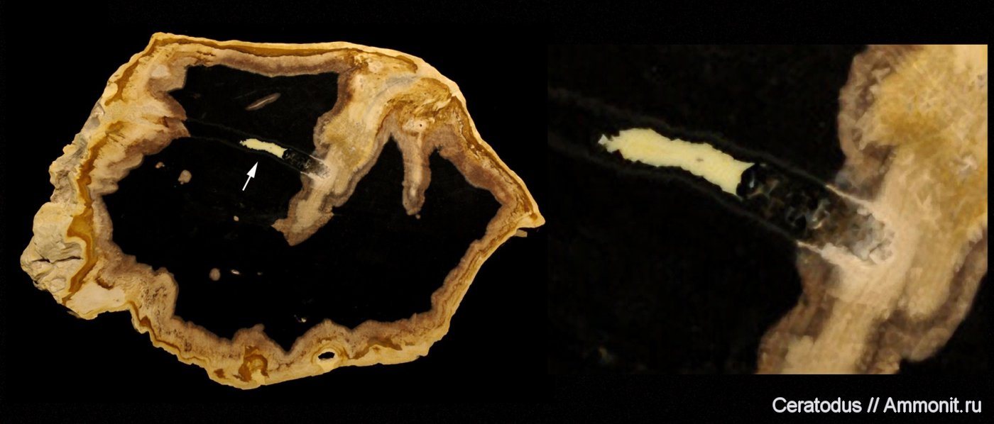 Слева представлен общий вид поперечного среза. Стрелкой указан ход, проделанный древоточцем (скорее всего каким-нибудь насекомым). С правой стороны увеличенная часть среза, содержащая ход. Размер образца 16х12.5 см, толщина 1.5 см. Фото этого образца помещено на стр. 333 в книге "Ancient Forests: A Closer Look at Fossil Wood", авторы Frank J. Daniels and Richard D. Dayvault, 2006.