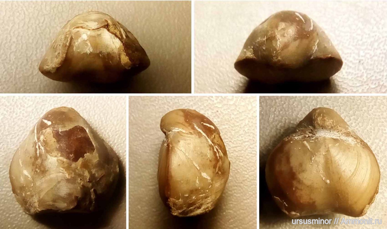 Предположительно, раковина старческая: она в полтора - два раза крупнее всех остальных моих образцов этого вида, и, кроме того, у ее синуса есть дополнительный изгиб (прогиб вверху), чего нет ни у других моих образцов, ни у образцов на сайте.