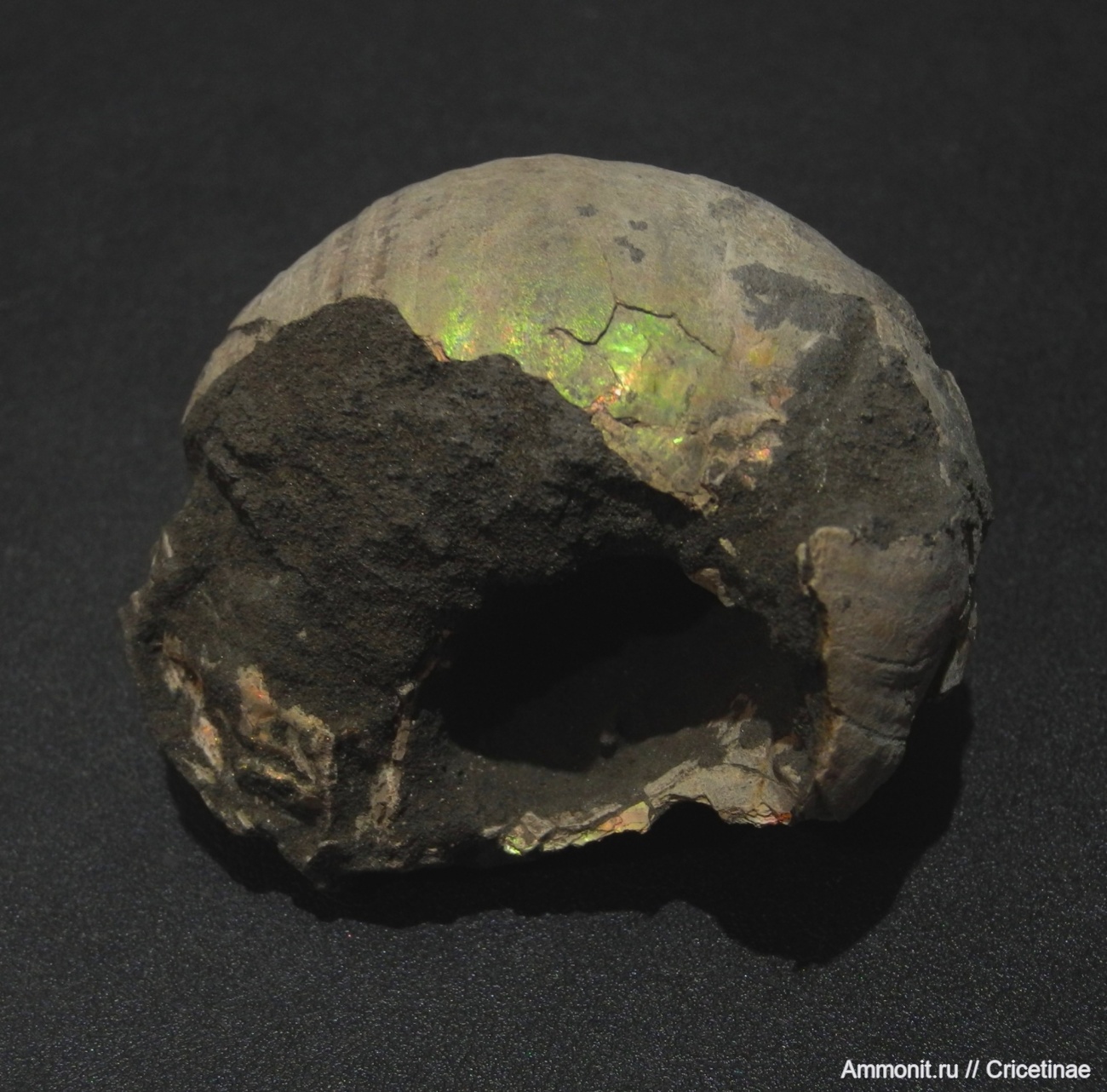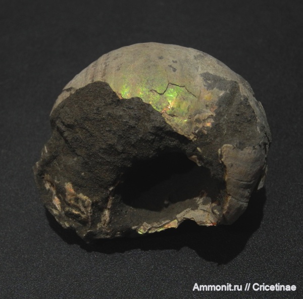 Да, я тоже думаю, что это либо Cadoceras elatme, либо какой-то rondiceras, центрушки нет, чтобы точно сказать. Это не конкреция, отдельный аммонит. Остаток жилой камеры у него заполнен чёрным сильно спрессованым песком, а сильно сдавленный фрагмокон у него пиритовый. | ||||||