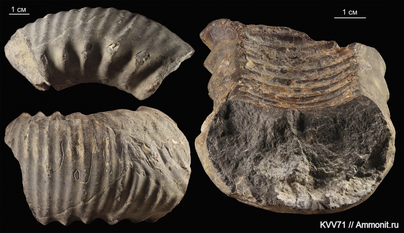 Виновников залеченных повреждений у аммонитов трудно установить. Тут видно, что кто-то выломал у него кусок раковины, но кто именно - я бы не брался судить. Может рыба, или молодой завр, или крупный рак, или кусачий наутилус. Что их находок нет или мало - это не показатель, они просто могли не сохраняться. | ||||||