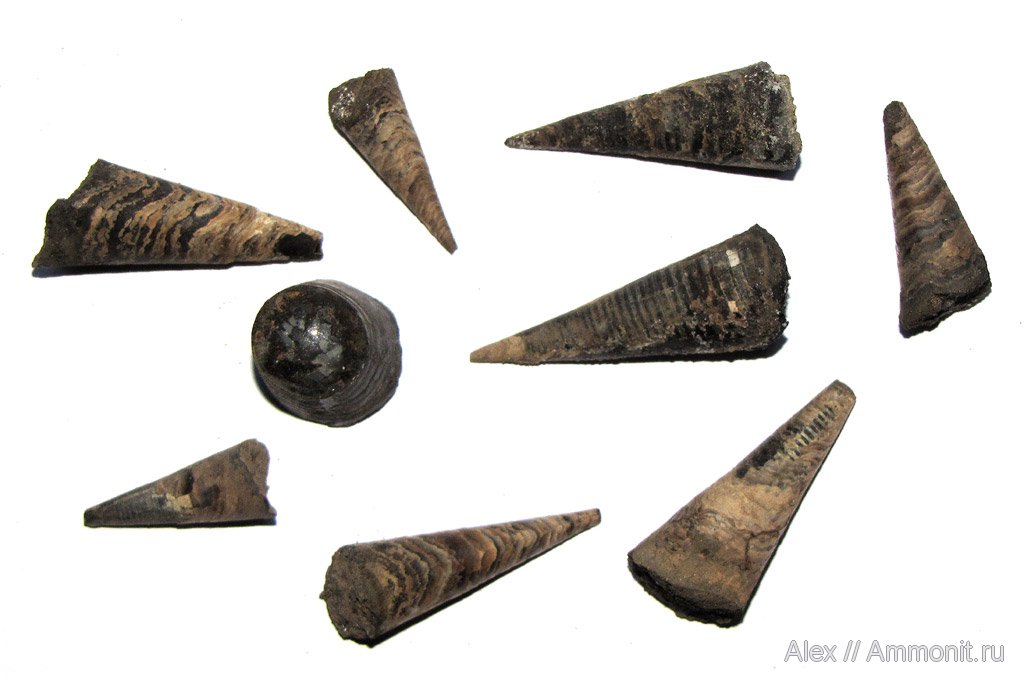 Фрагмоконы белемнитов, вывалившиеся из ростров. Белемниты, как и большая часть головоногих моллюсков, имели раковину, разделенную на отдельные камеры. Но у них эта раковина была очень маленькой и находилась внутри крупного ростра. Вперед, к голове животного, раковина продолжалась тонкой пластинкой под названием проостракум, но она очень редко сохраняется в окаменевшем состоянии. А основная часть раковины, с перегородками, называлась фрагмоконом.