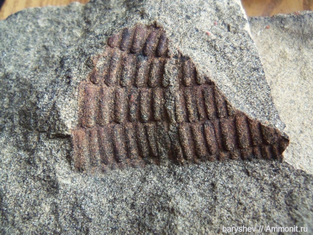 Тоже отпечаток стебля пермского хвощевидного растения, нижняя часть побега, т.к. междоузлия слишком близко друг к другу.