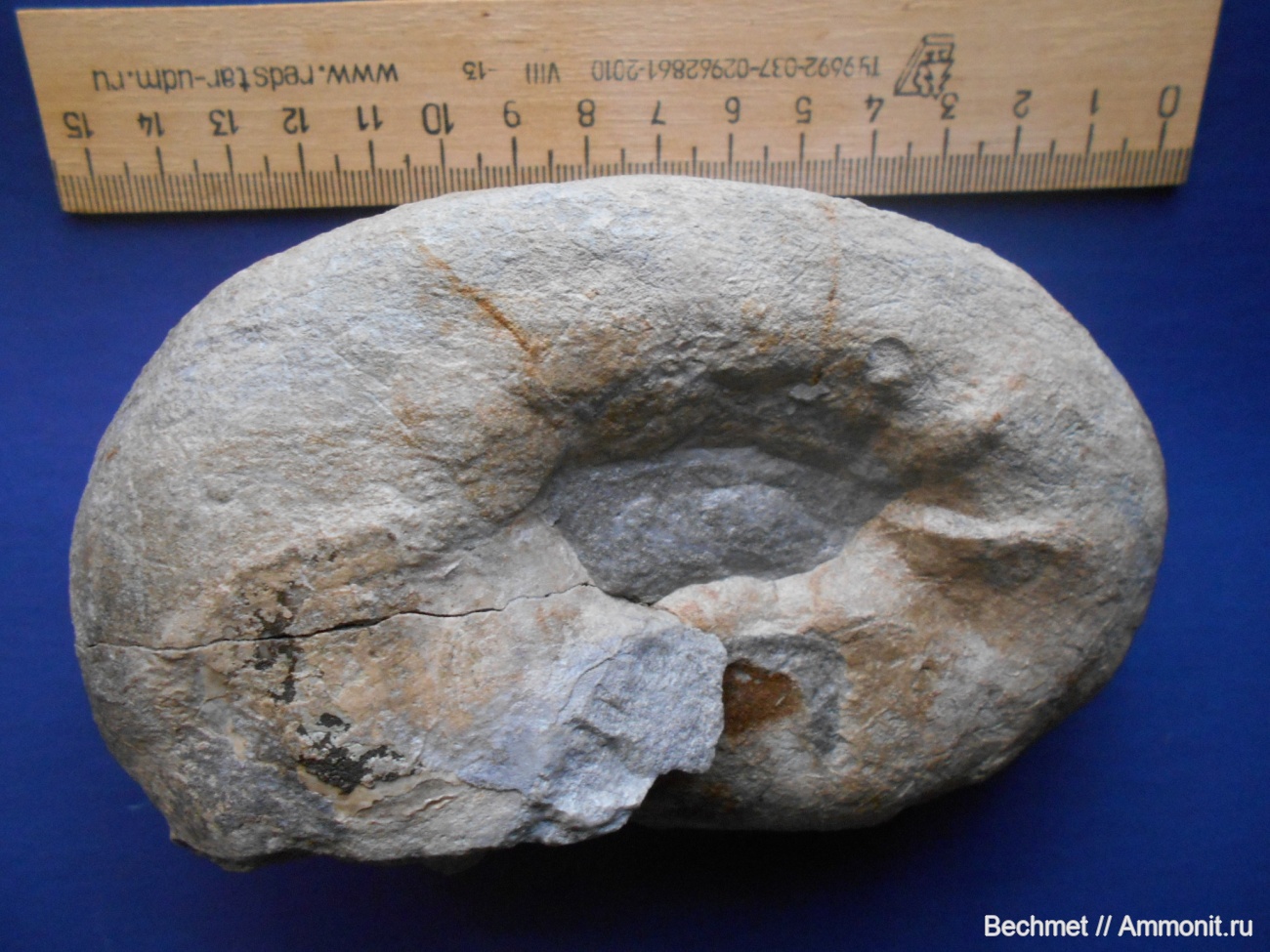 На самом деле тут все понятно и давно известно. Это ядро, арагонит раковины давно растворился. При растворении он часто становится пластичным (возможно, не сам арагонит, а сохраняющися в это время наружный конхиолиновый слой раковины). В общем, растворяющася раковина становится пластичной. Если она лежит плашмя - она сминается с латеральных сторон, а если стоит в осадке вертикально - получаются такие "псевдогетероморфы". Они много где есть, это не редкость. В ПИНе я видел аммонита, который "обтекает" белемнит, на котором лежит, надо будет сфоткать. | ||||||