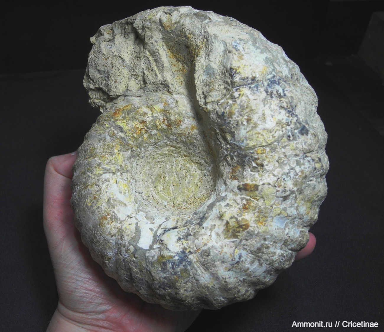 Размер 16 см, замещён мергелем. Тут фото с другой стороны. А это фото вентра. Пупок у аммонита не сохранился.