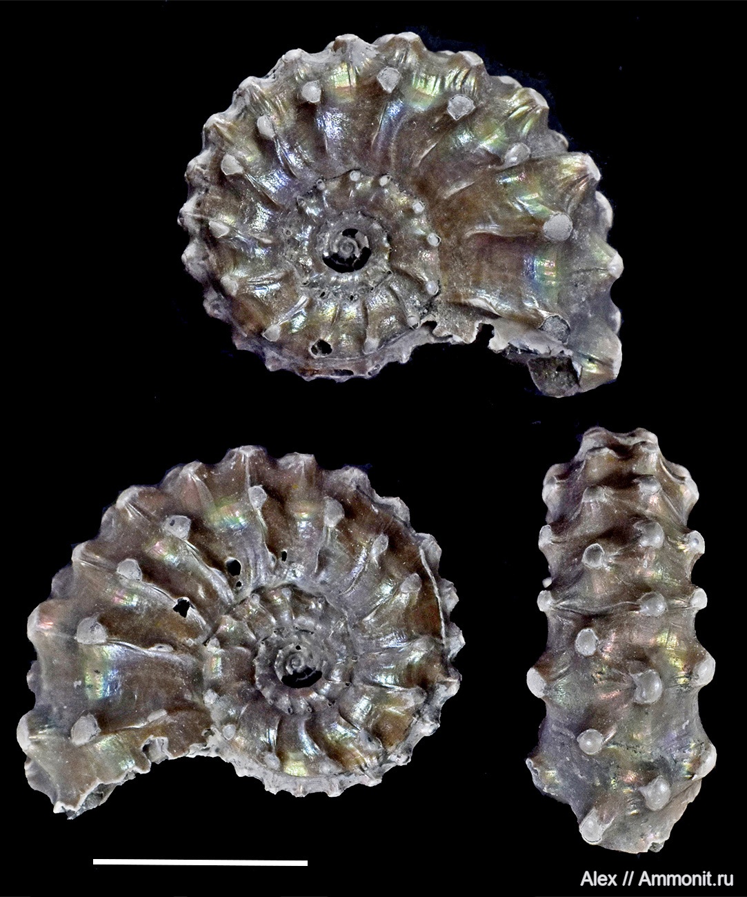 Маленький космоцерас из Михайлова, с определением которого я затрудняюсь. Предполагаю, что Kosmoceras pollux, но может быть и не он. Бугорки-шипы у него на вентре сначала шли парами, а потом, в результате какого-то сбоя, стали расти в шахматном порядке. Судя по следу жилой камеры это не пупок большого аммонита, а фрагмокон микроконха. Длина масштабного отрезка 1 см.