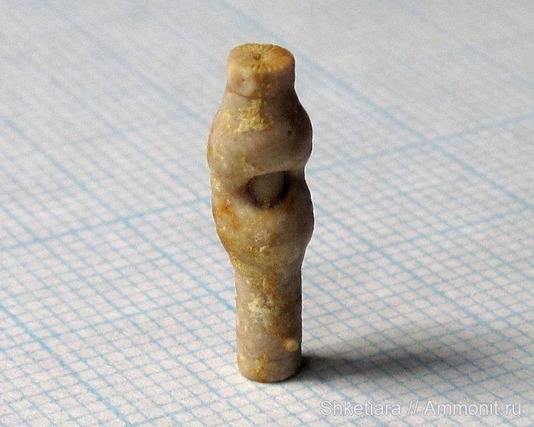 Среди очередной промывки в Гжели попался красивый экземпляр. Фрагмент из нескольких члеников стебля морской лилии, в средней части которого - характерное разрастание, вызванное прикреплением эпибионта Phosphannulus. Диаметр стебля на участке разрастания около 4,5 мм, тогда как рядом - 3 мм. Мне сложновато рассуждать о тонкостях паразитизма или комменсализма, но впечатление такое, будто морская лилия всеми силами стремилась отвести свои ткани подальше от места поселения эпибионта. Внешний вид разрастания довольно-таки напоминает галлы на растениях.