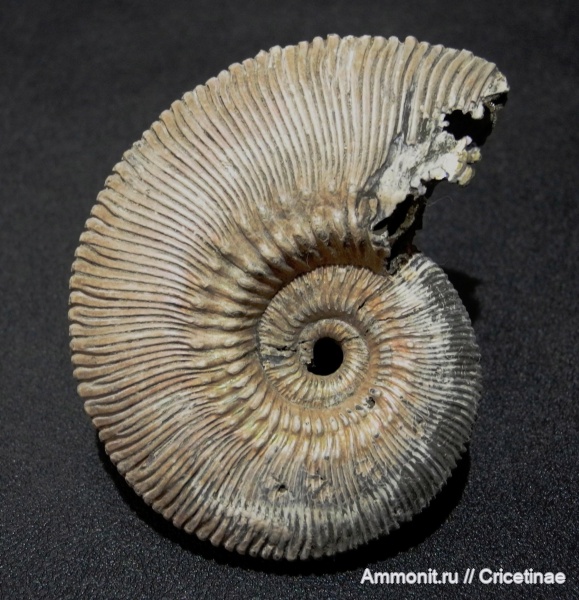 Размер 6,5 см. Странность данного Kosmoceras в том, что сначала рёбра у него идут тонкие как у grossouvrei или phaeinum, а ближе к концу фрагмокона рёбра сплющиваются и начинают сдваиваться к вентру как у proniae.