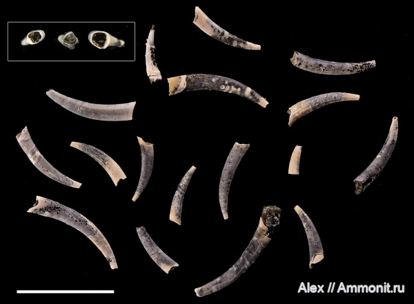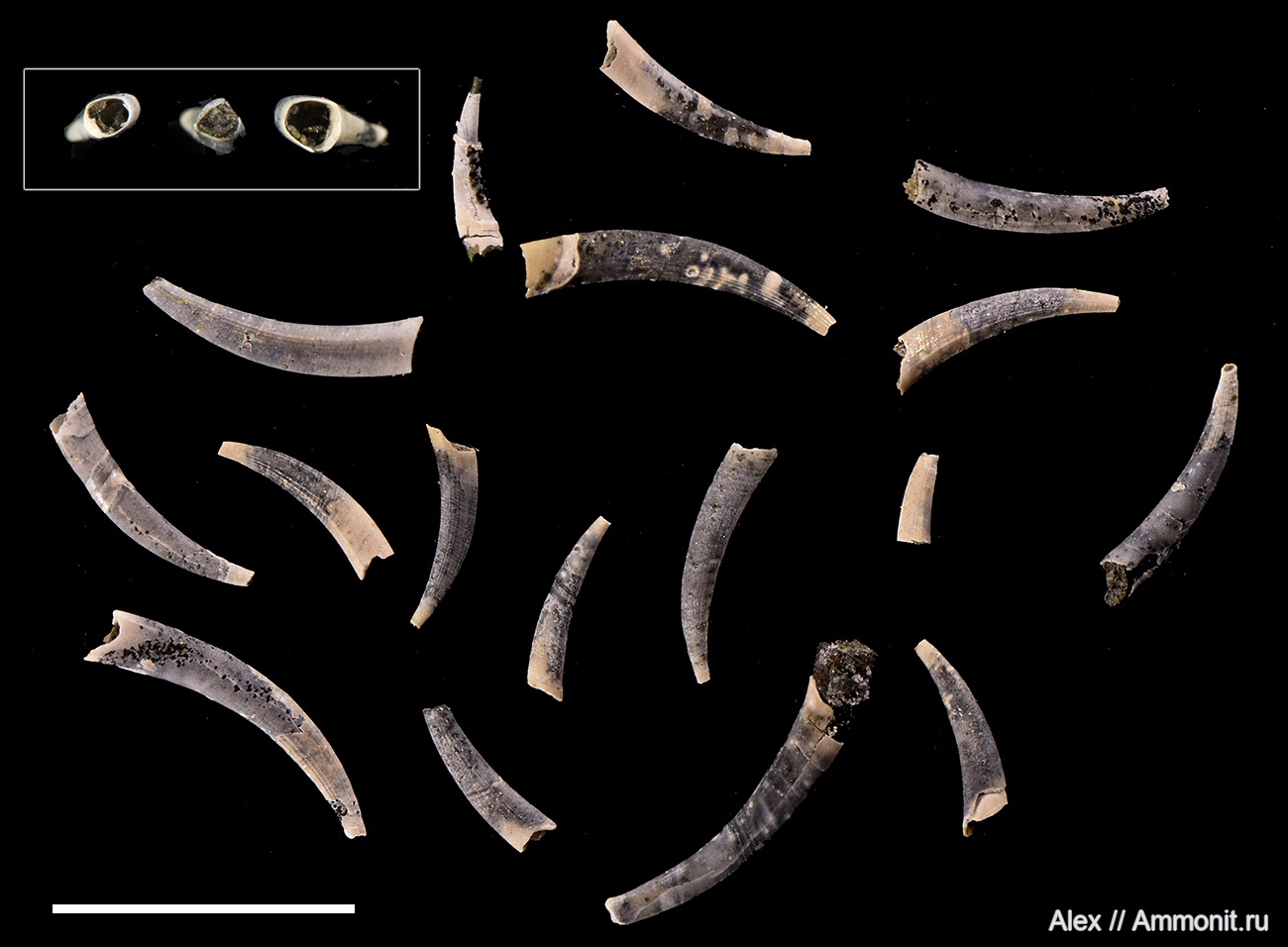 В черных глинах аптского возраста в окрестностях Широкого Буерака встречаются маленькие изогнутые расширяющиеся трубочки скафопод. Их поверхность покрыта тонкими продольными ребрышками. Сечение (показано в верхнем левом углу) округло-трапецевидное. Длина масштабного отрезка на фото 5 мм.