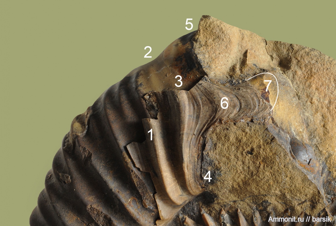 После строительства предпоследнего стандартного ребра (1), аммонит начинает формировать конечное устье. В нижней части сечения по вентральному краю происходит одностороннее сужение оборота за счет предустьевого пережима (2). После этого строиться последнее фальшребро (3). Это фальшребро отличается от всех стандартных ребер раковины тем, что имеет только внешнюю скульптуру, изгибается наружу и судя по ядру, внутренняя часть устья в этом месте уже абсолютно гладкое. Верхняя часть устья (4) на этом этапе останавливается и уже больше не растет. Нижняя часть устья (5) после пережима еще, какое то, время выдвигается вперед и формирует небольшой закругленный ростр, больше похожий на губу (как у филло- и литоцератид). Вместе с этой губой по центру боковых сторон начинается и строительство двух ушек (6) – основного полового признака самца аммонита. Ко времени окончания формирования нижнего ростра, ушко уже имеет достаточно приличный размер и это можно проследить по границе общей линии нарастания (чуть дальше от «6»). Раковина полностью прекращает свое строительство, а на ушках начинает формироваться лопатообразное расширение (7). Это последнее, что мантия достраивает на раковине аммонита.