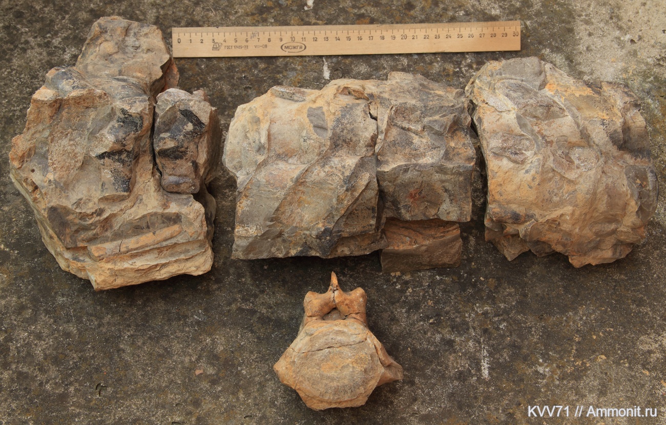 Образец с камазной кучи. При расширении дороги экскаватор копал склон, порода шла на отсыпку пониженных мест. Фауна и флора в плитах. По сколам костей и породы понятно, что было продолжение скелета, жаль, что его не нашли в кореннике и растащили по разным местам.