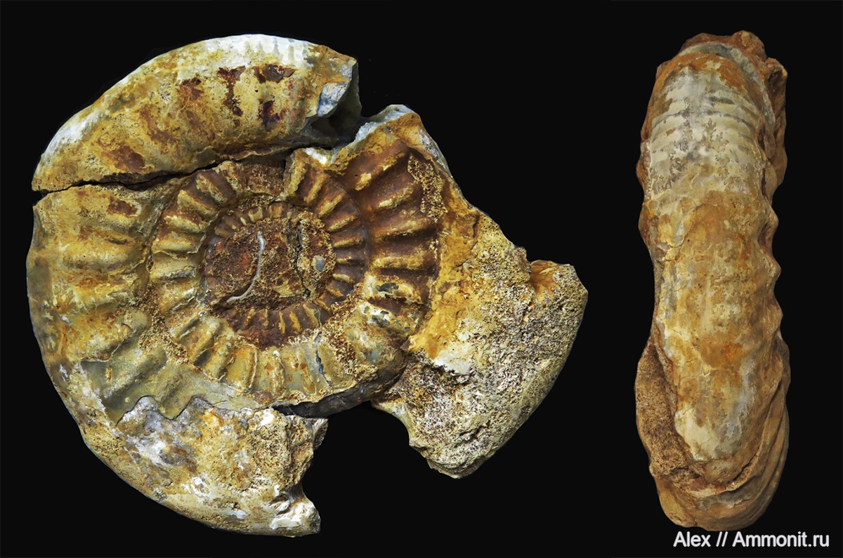 Недавно опубликованная уважаемым Aleko фотография ребристой Choffatia transitoria из Никитино сподвигла меня вывесить этот ребристый аммонит из того же местонахождения. Сохранность у него очень паршивая, но хотелось бы его определить. Диаметр 25 см, при жизни он был больше. Жилось ему не просто: на ядре видны следы залеченных травм (одно вздутие слева вверху над трещиной, другое слева внизу). Найден он был, если за давностью лет я ничего не путаю, в слое с обычными колесоцерасами между слоями конкреций. Однако, он намного ребристее большинства никитинских колесоцерасов. На сайте есть похожие аммониты, но все они определены по-разному: