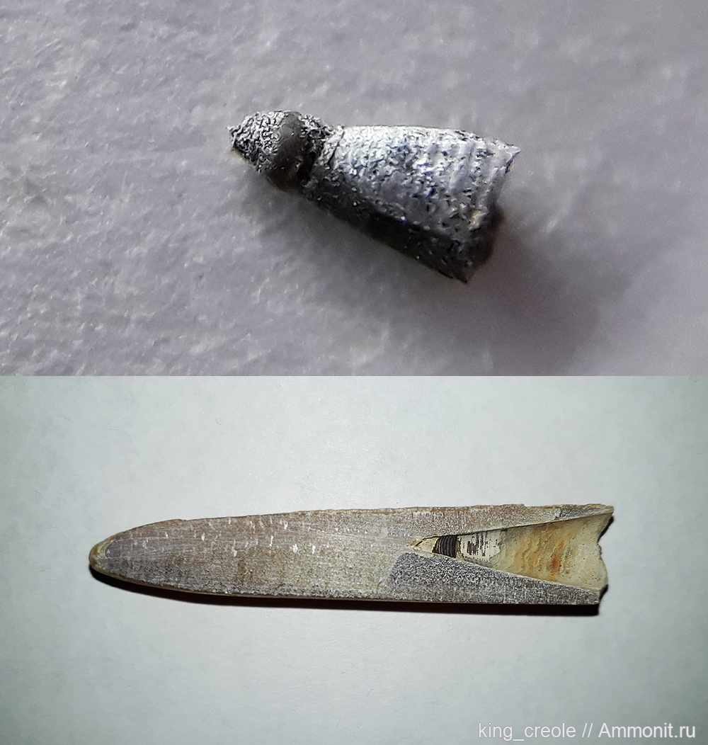 Берем белемнит с целой, не вымытой серединкой. Спиливаем почти половину. За 1мм до точной середины пилим аккуратно. Протоконх выпадает. Он мелковат, для фото взял телефон и объектив 16x от микроскопа.