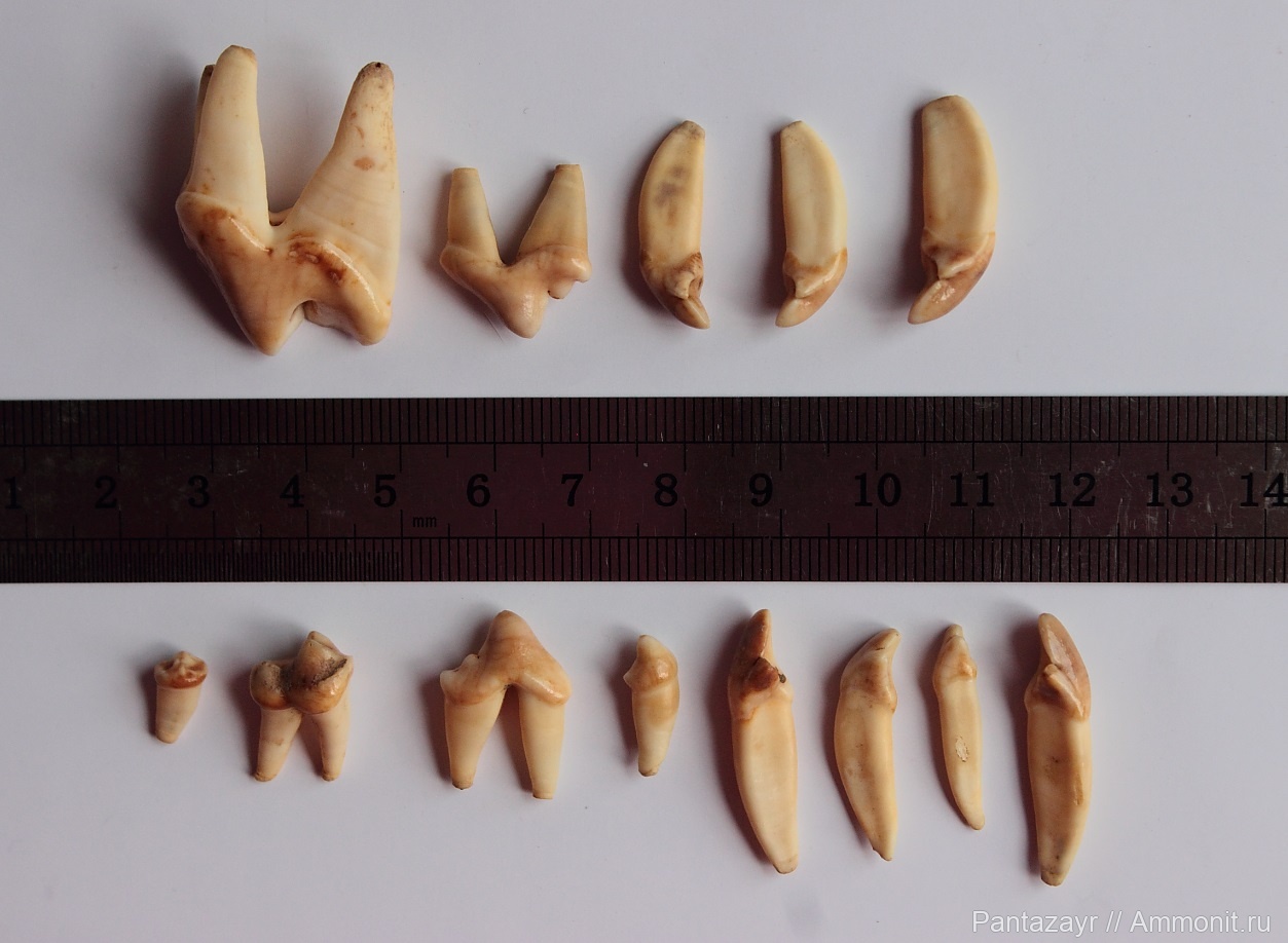Зубы волка с верхней и нижней челюстей. Все зубы принадлежат одному животному.