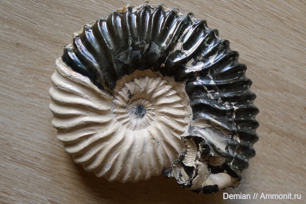 Белый - там, где схранился перламутр. Где он осыпался, там черный (как правило, ЖК у них заполнены воронено-черной породой), а если откроется фрагмокон - то кальцитовый разных оттенков. | ||||||