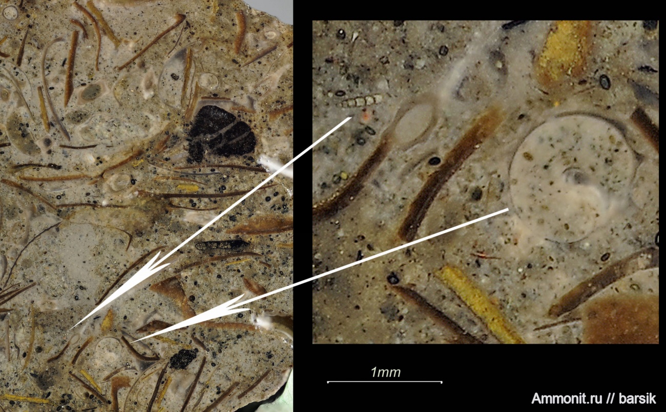 Слева максимально возможное увеличение, на которое возможна самая простая схема : фотоаппарат + макрообъектив. Вверху что-то похожее на узкую длинную гастроподу, длинной 0.3мм . Ниже ядро раковины фораминиферы, чуть меньше 1 мм. По всей породе разбросаны микроконкреции черного цвета, наверное соединения марганца.