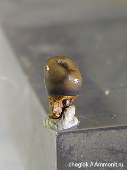 Привезя несколько кг отсева из Пудовкино, я не удержался и слегка порылся в нём, оставив основное на зиму. Один из трофеев -- нечастый в сеномане зуб пикнодонта, причём с частью корня и формы почти человеческой. Размер 5мм.
