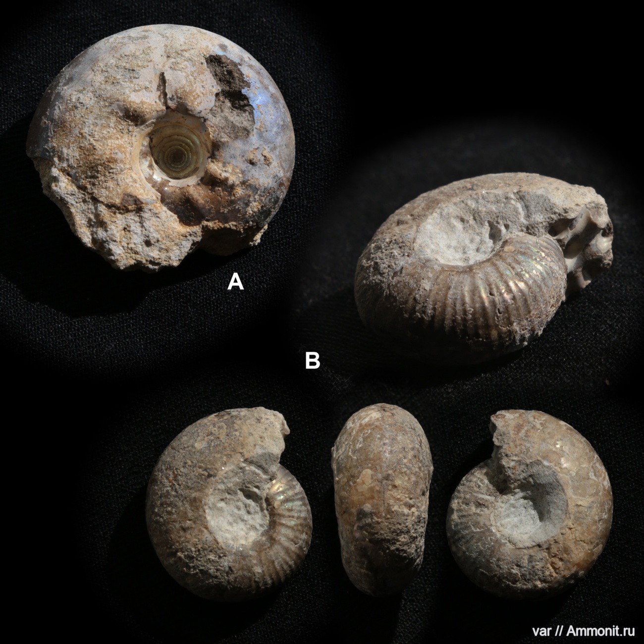 Два аммонита из майских 2019 г. сборов. Максимальные размеры образцов: А - 4 см, В - 2 см. Буду благодарен за определение.