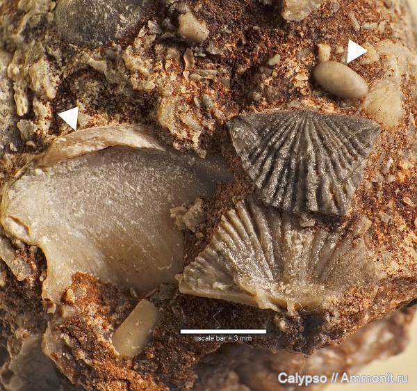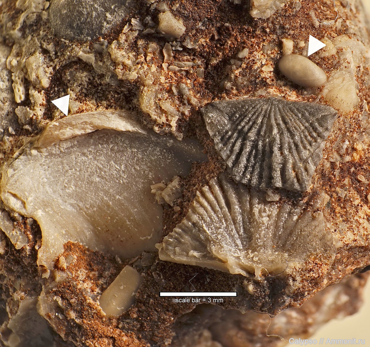Кроме того, имеется раковинка неопределённой остракоды (обозначена треугольником справа) и фрагмент створки пентамериды Porambonites sp. (обозначена треугольником слева).