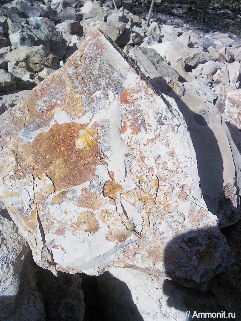 Довольно обычный для карбона отпечаток дна. Таких слоёв в толще карбона несколько, где целое месиво брахиопод, мшанок, остатков иглокожих. Зубы в них тоже попадаются, но редко. | ||||||