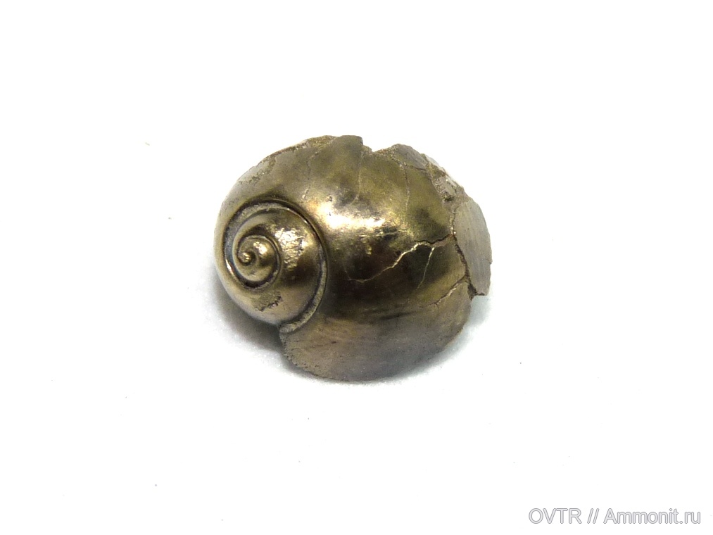 При поиске пиритовых аммонитов попадаются и их "соседи" - двустоврки, гастроподы. Вот одна из них, названия не знаю :-( Такой вид попадается редко. Диаметр "золотой улитки" 8 мм