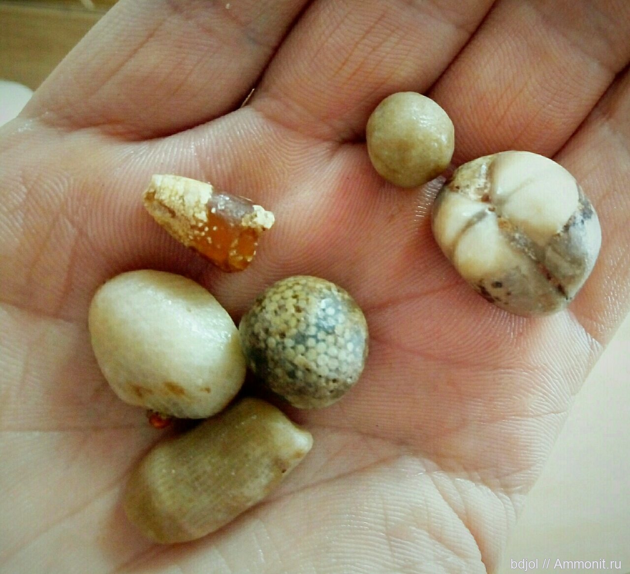 Галька из моренных отложений. Судя по раковине порамбонитеса (крупная раковина брахиоподы на ладони справа вверху) камни притащило ледником с Балтоскандии. | ||||||
