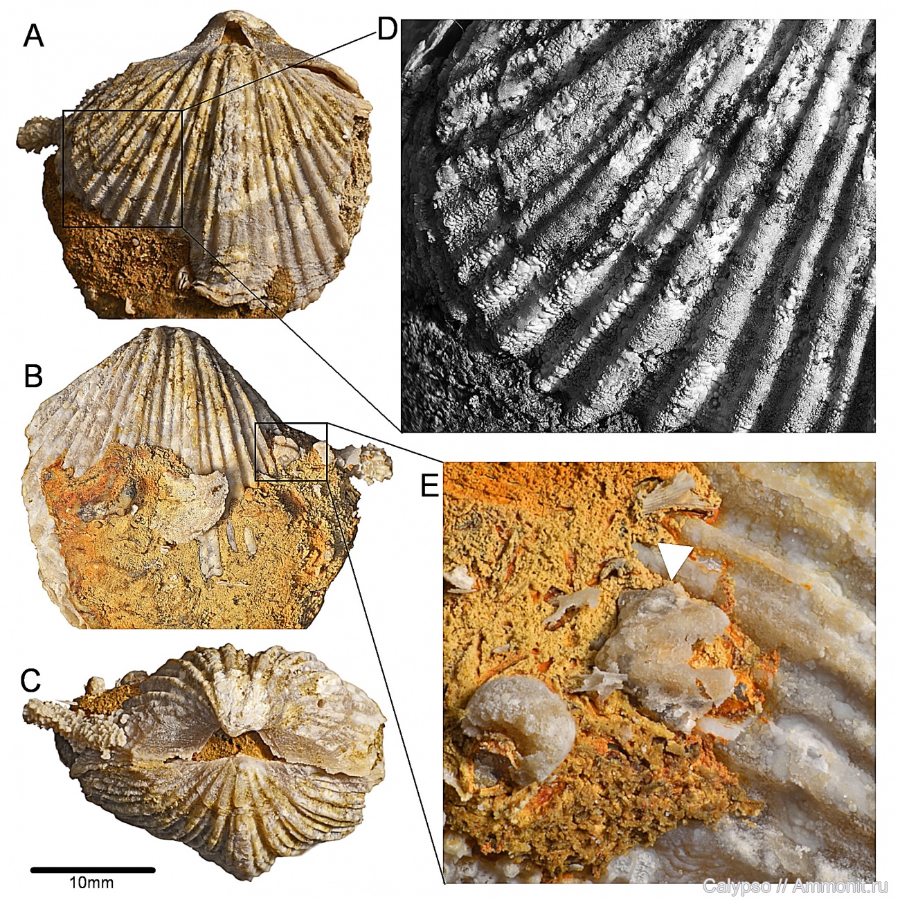 После окончания препарации заметно проявилась скульптура раковины (врезка D)- увеличенный участок спинной створки (A). Так-же удалось обнаружить комплекс прирастающих и занесённых с осадком организмов: