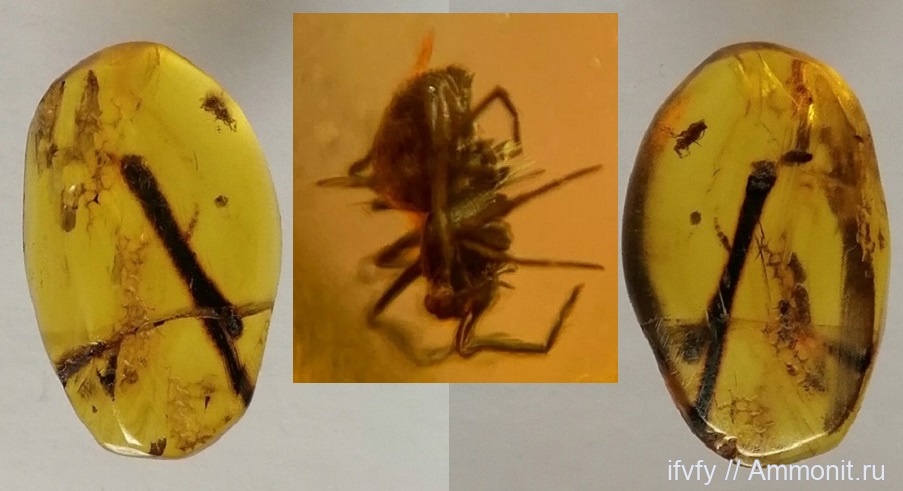Маленький паучок в бирманском янтаре. Размер янтаря 18 х 11 мм, размер паучка где-то 1,5 мм. Кроме паучка присутствует веточка.