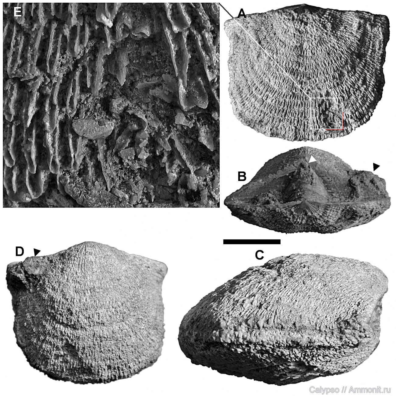 A - вид на спинную створку: хорошо видны концентрические пластины нарастания оканчивающиеся "бахромой". На первый взгляд может показаться, что эта "бахрома" образованна мельчайшими иголочками, но при сильном увеличении (увеличенный участок E) становится ясно, что мы обнаруживаем несколько иное строение: пластины нарастания оканчиваются отростками- трубочками в виде узких продолговатых желобков, черепицеобразно накладывающимися друг на друга. В макушечной области они не так сильно проявлены, а то и вовсе могут оказаться затёртыми. По мере роста раковины количество их возрастает с геометрической прогрессией. Особенно это заметно на старческих раковинах в близи лобного края и по передней комиссуре, когда у животного были задержки в росте. При этом, в некоторых случаях, раковина спереди может выглядеть буквально как "взъерошенной" (пластины нарастания резко отходят друг от друга, от чего раковина становится похожей на ёжика).