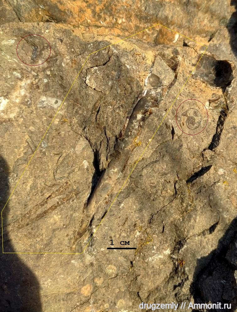 Сколько я видел скафопод - у всех раковина изогнутая, а здесь прямая. Да и великовата она для скафоподы. Мне кажется, это какая-то ортоцератида. | ||||||