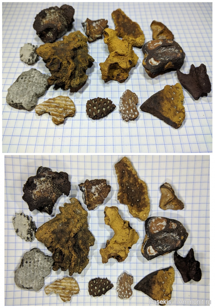 Самые крупные и целые обломки что мне попались. Много разных фрагментов, самый интересный в нижнем левом углу - субквадратные остия располодены в горизонтальных и вертикальных рядах. Если это так - то возможно, это Porocyclus sp., род характерен для кампана - маастрихта.