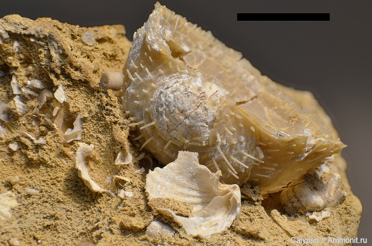 Относительно небольшая раковина аулостегеса, "лежащая" на брюшной створке. Основной вид на задний смычный край с макушкой, с радиально расходящимися опорными иглами.