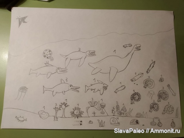Это всё конечно хорошо, но почему тут почти все аммониты пузом кверху плавают? Они ведь так при всем желании перевернуться не могли, тяжелым телом поверх поплавка-фрагмокона! Только один аммонит, непронумерованный, который к стае плиозавров примазался, нарисован в правильном положении.