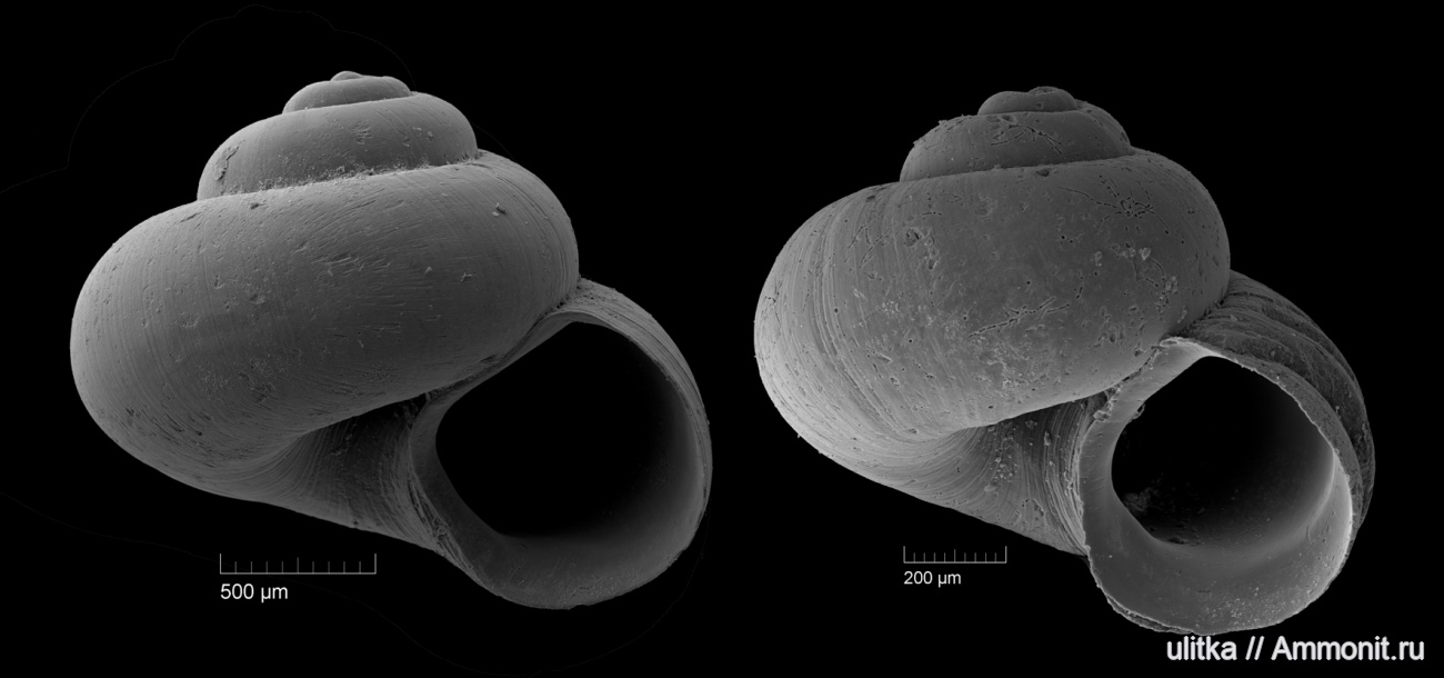 На фотографии две гастроподы, одинакового облика и размера, но по сегодняшней классификации принадлежат представителям разных подклассов. Различаются по одному неявному признаку, который, однако, чётко отделяет одних от других. На боковом фото он не виден.