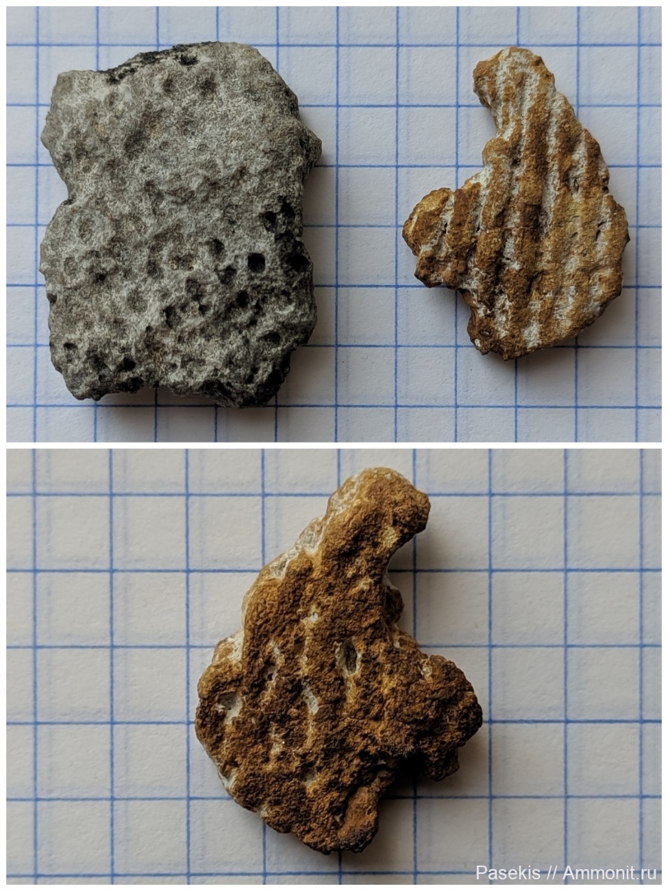 второй фрагмент изображен с обеих поверхностей, выполнен оксидами железа - Ventriculitidae? За определение спасибо пользователю khutoryanin.