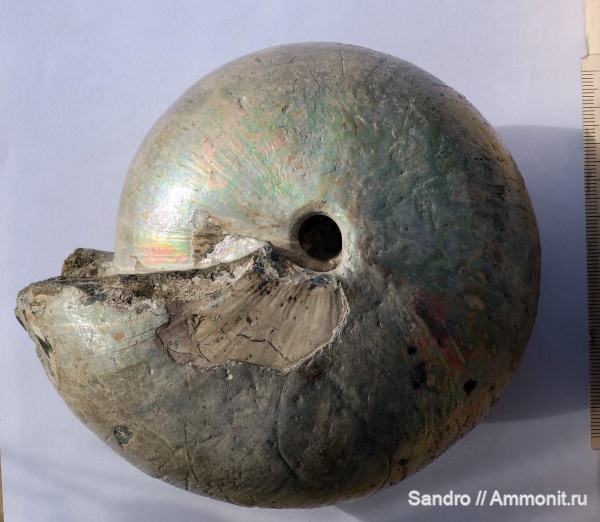 Фото с вентра - вид на устье. Обратите внимание на сколько различается сечение раковины на последнем и предыдущем обороте. От треугольного к квадратично-овальному.