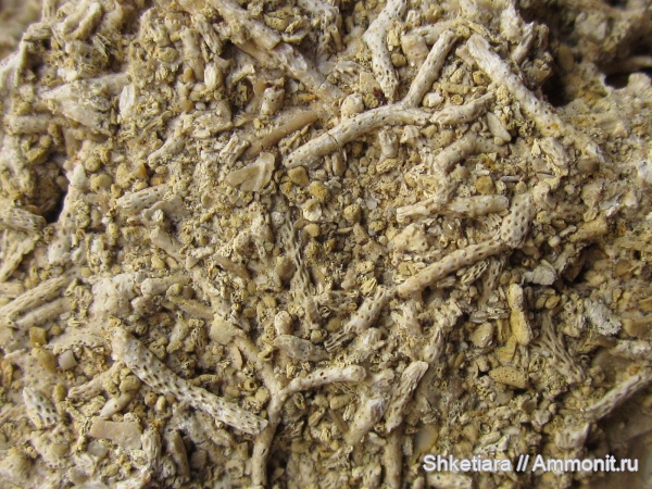 Но все-таки этот образец казался каким-то не таким. После мытья и при фотографировании я убедился в этом. Он состоит не из иглокожих, а из мшанок. Первый раз такое вижу, даже в Гжели мшанки как-то скромнее. Даже сомнения появились: карбон ли? Или, может, юра? Ведь явно карбоновых находок в Тимонино, кажется, не было. На дополнительном фото общий вид образца.