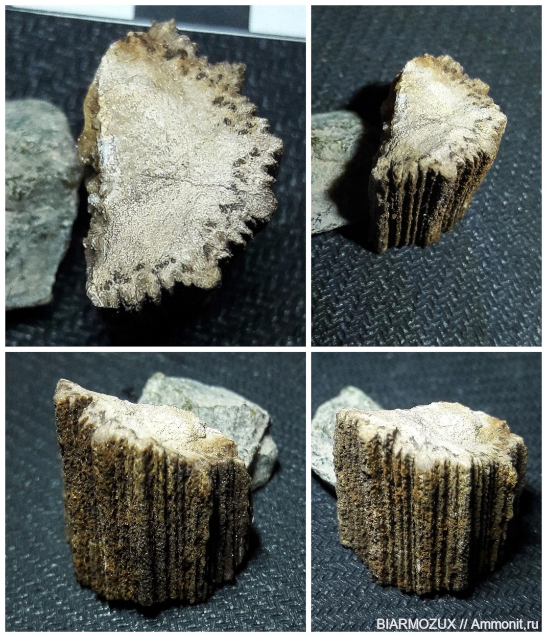 Дело в том что дневная поверхность каламита гладкая, а вот слепок внутренней полости имеет ребристую скульптуру, рёбра имеют одинаковую высоту и длину, т.е. ни каких рёбер "первого и второго порядка" и проводящих сосудов под этой поверхностью быть не может, впадина между рёбрами это и есть проводящие сосуды, а основным признаком членисто стебельного растения является наличие узлов. И кстати, проводящие сосуды у каламита находятся на внутренней поверхности ствола и у каламита не эпидерма а ксилема, т.е. древесина. А вот то что у вас, это дневная поверхность голосеменного растения близкого кордаитам, вот в таком случае наличие проводящей системы возможно. Ведь я не случайно акцентировал ваше внимание на моей публикации по кордаитам и конкретно на определённой таблице. Если вы внимательно посмотрите на образцы в этой таблице вы увидите свой образец. | ||||||